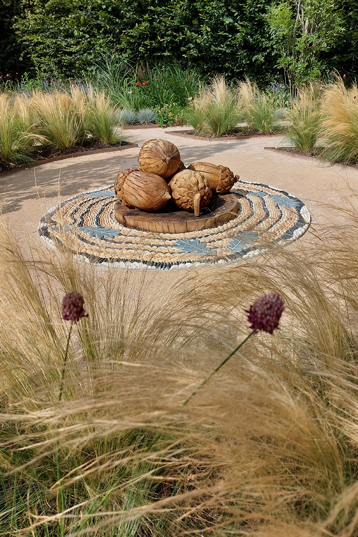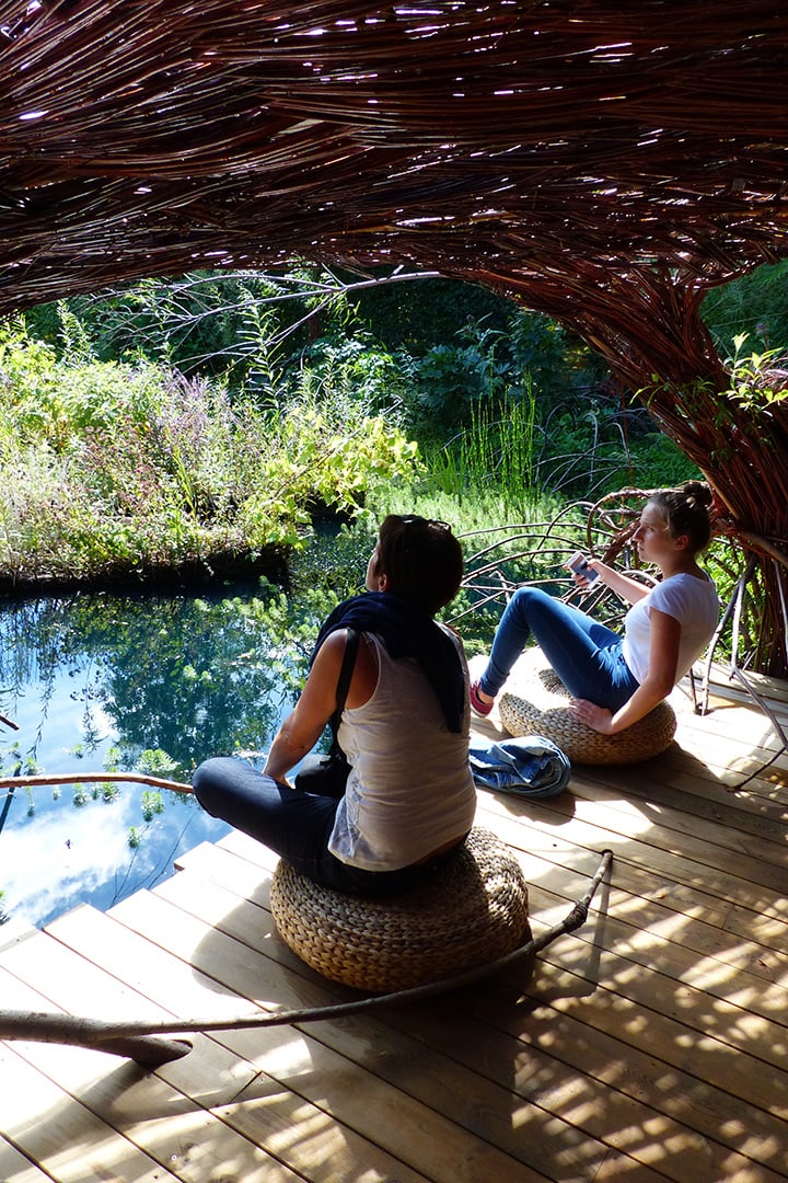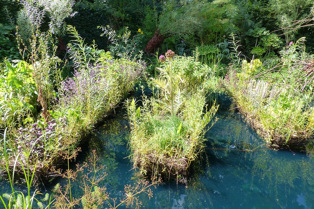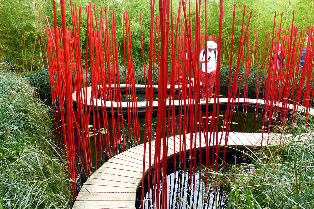 Plus loin, dans les prés du Goualoup on trouve les créations pérennes d’artistes et paysagistes internationaux, telle que l’œuvre Carré et Rond de Yu KongJiang, une pièce d’eau sur laquelle serpente une passerelle de bois agrémentée de long bambous rouges.