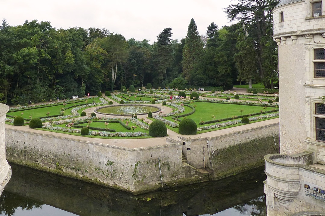 À la mort accidentelle d’Henri II lors d’un tournoi, la reine Catherine de Médicis s’empresse de reprendre Chenonceau à sa rivale. Dès lors, elle entreprend d’importants travaux d’aménagement, dont l’élévation du pont enjambant le cher sur 3 étages ainsi qu’un jardin de promenade et de plaisir, avec vue sur la façade Ouest du château. Cinq parterres de pelouses agrémentés de buis, de lavandes et de platebandes fleuries encadrent un adorable bassin circulaire.