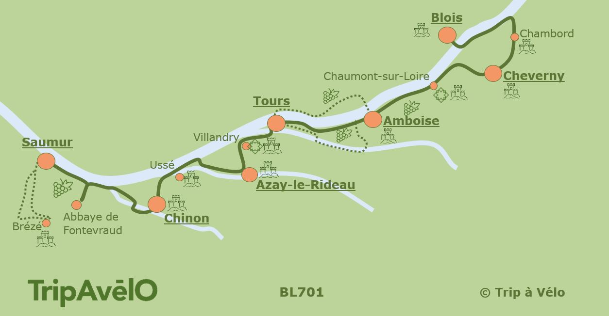 De pistes cyclables en petites routes de campagne, au rythme tranquille de votre vélo, l’itinéraire est jalonné de nombreux points d’intérêts tels que les châteaux de Chambord, Azay le Rideau et les jardins de Chaumont-sur-Loire et Villandry. Vous traversez des villes et villages pittoresques de la région : Amboise, Tours, Chinon, Montsoreau… et découvrez le patrimoine et la gastronomie locale : vins de Touraine et de Saumur, fromage Sainte Maure de Touraine, fouace de Rabelais…