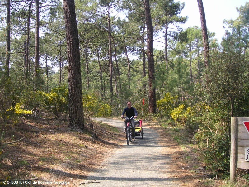Direction Arcachon avec un parcours sur une piste cyclable dans les pins et à proximité des immenses plages de la côte Aquitaine accessibles grâce à plusieurs chemins pédestres de quelques centaines de mètres.